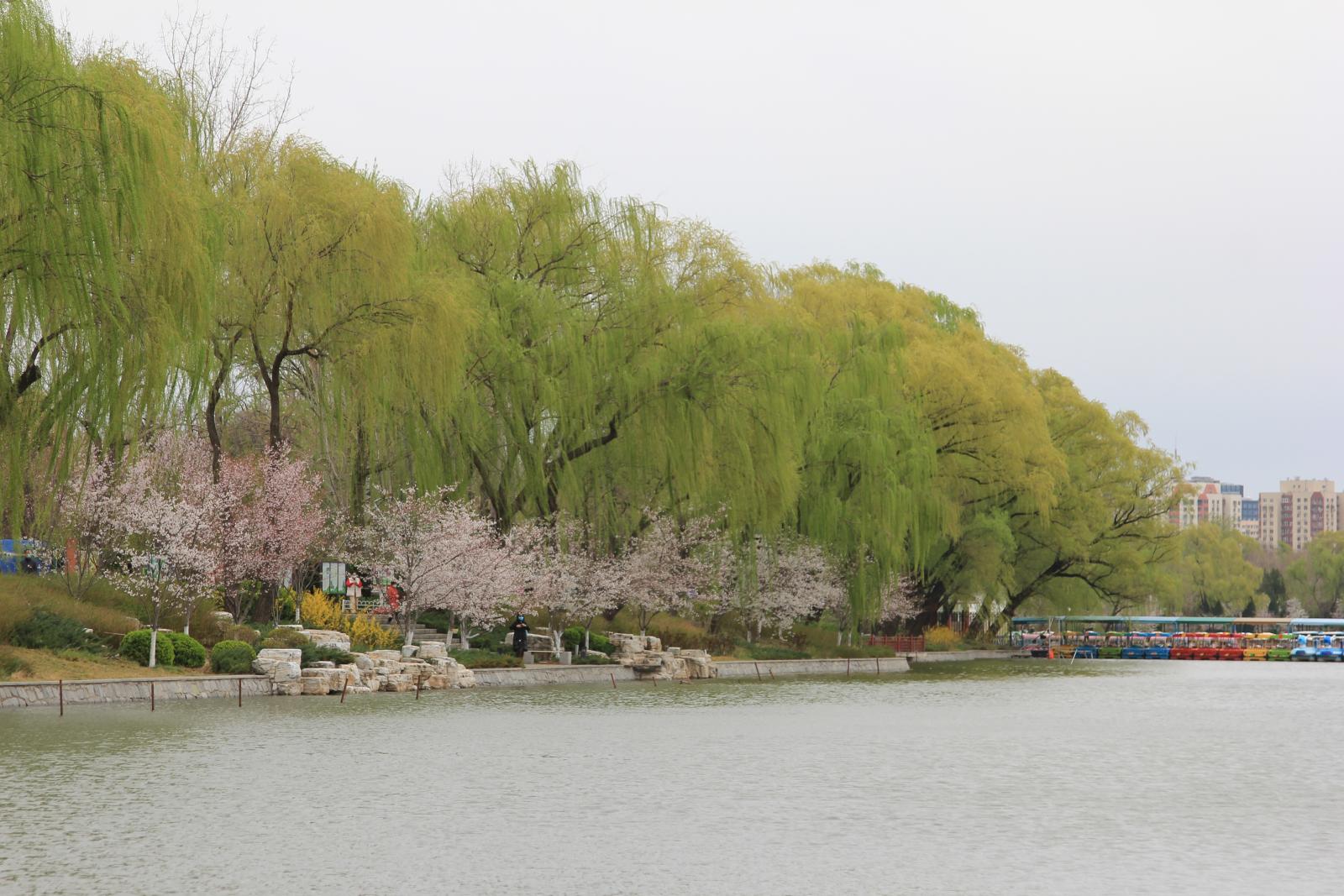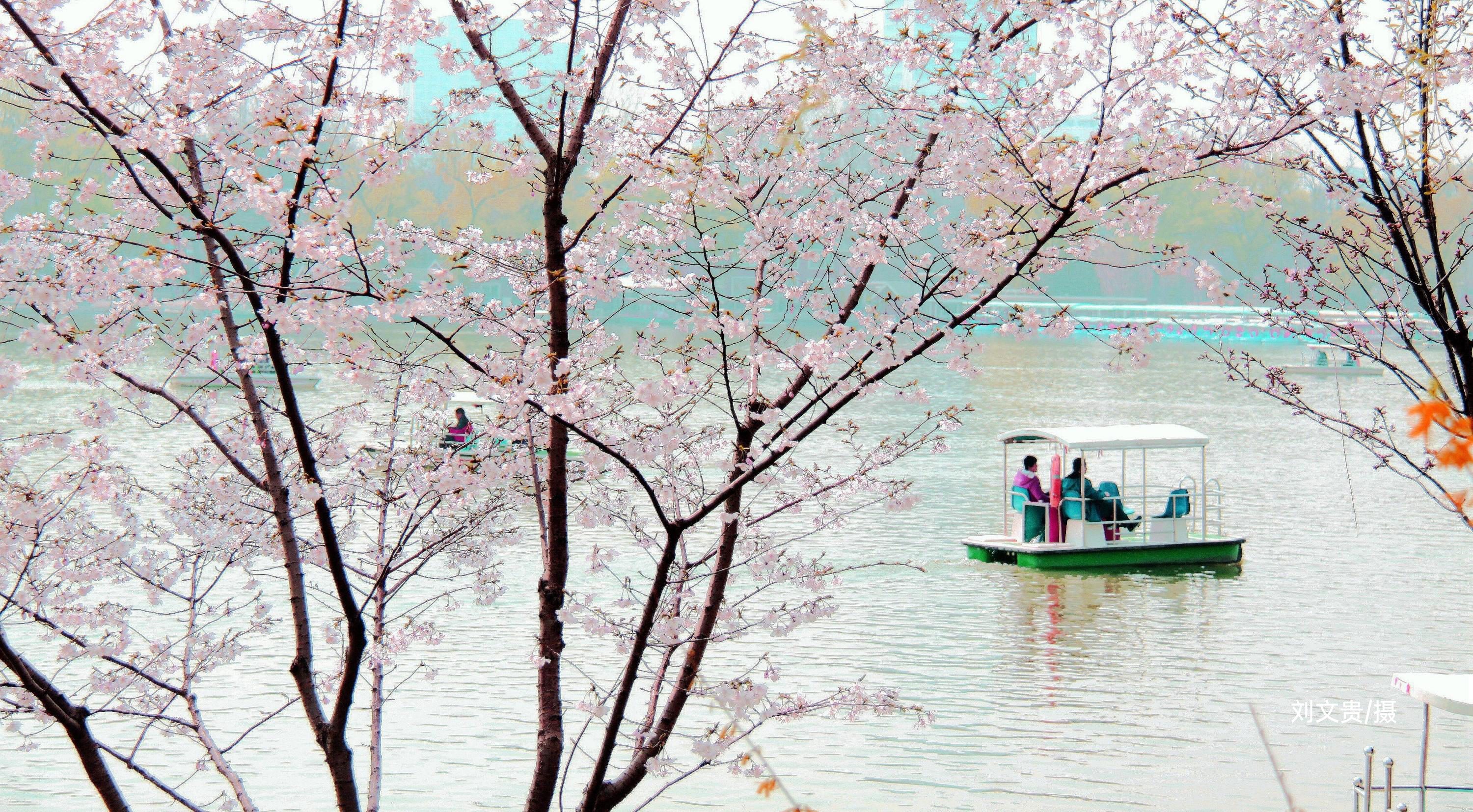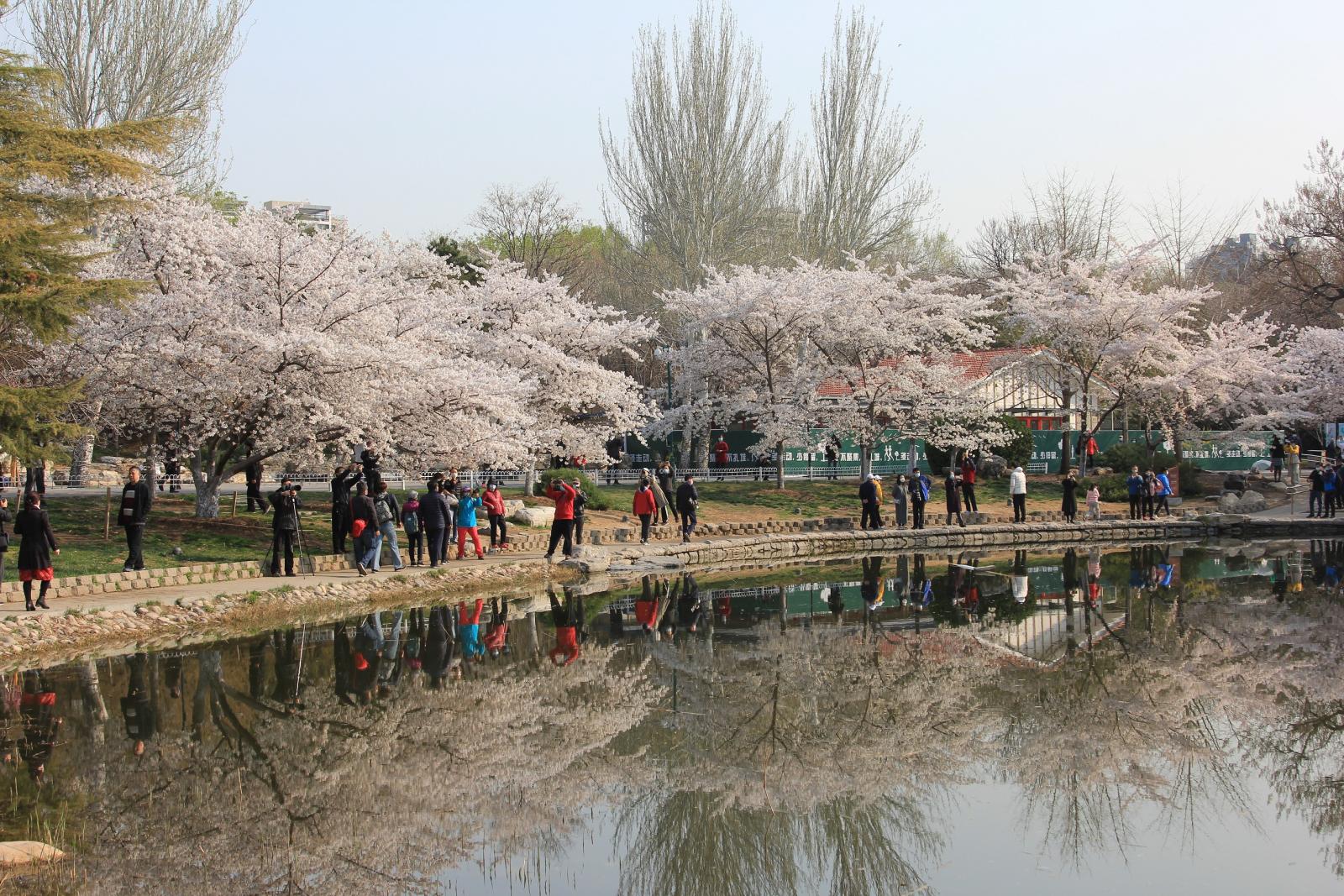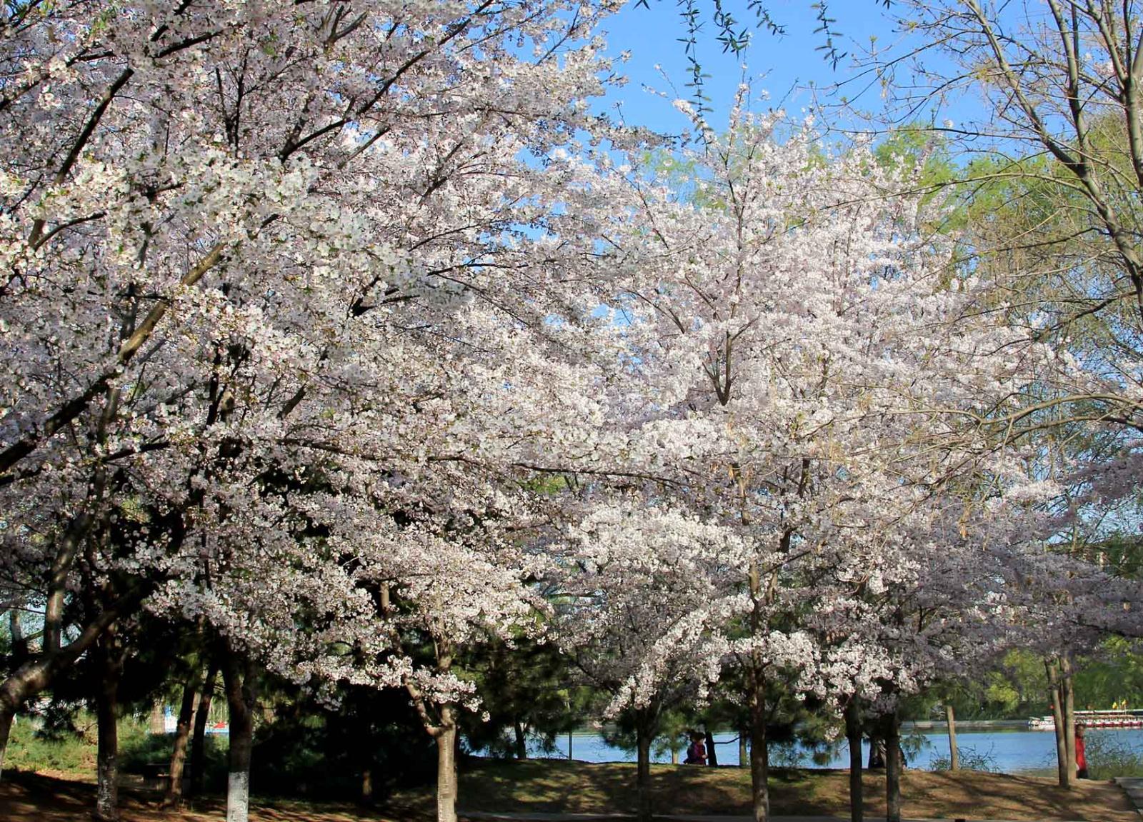 园内目前体量较大的一株吉野类樱花,独立湖畔丰姿绰约。她横生的花枝舒展秀丽,像热情开张的臂膀。她与春水相映而成的画面,已成为公园樱花的代表景致,也成为游人争相合影的佳处。