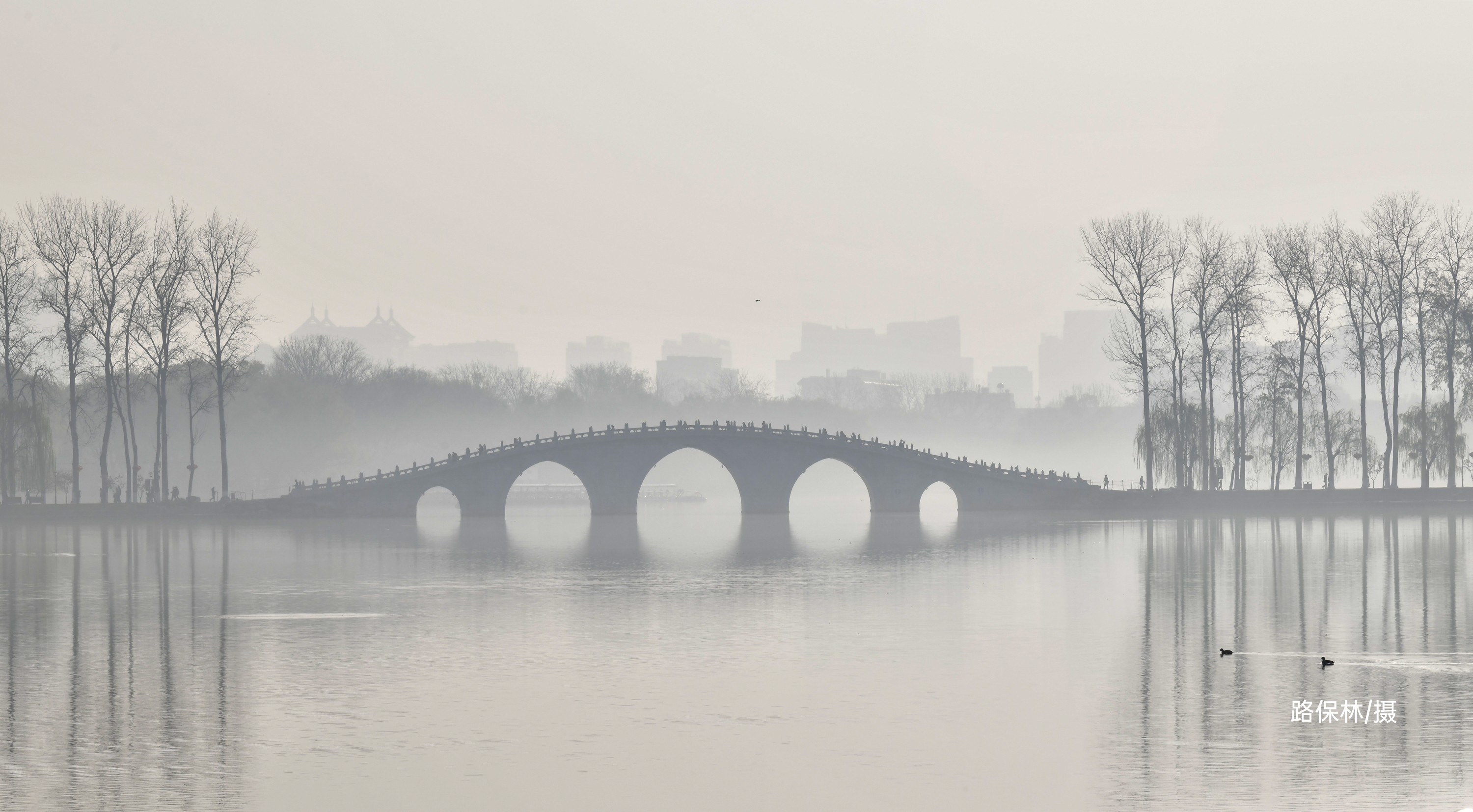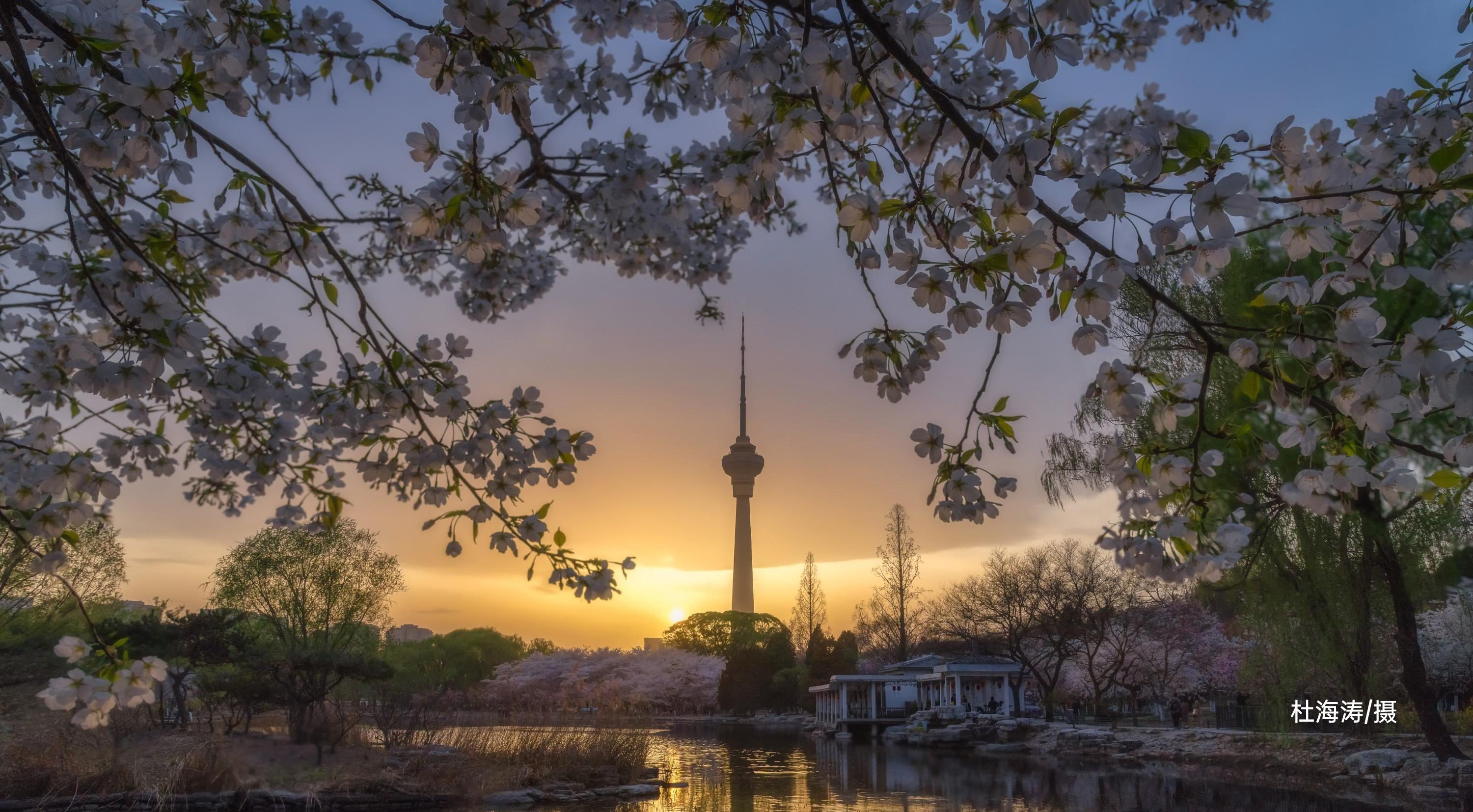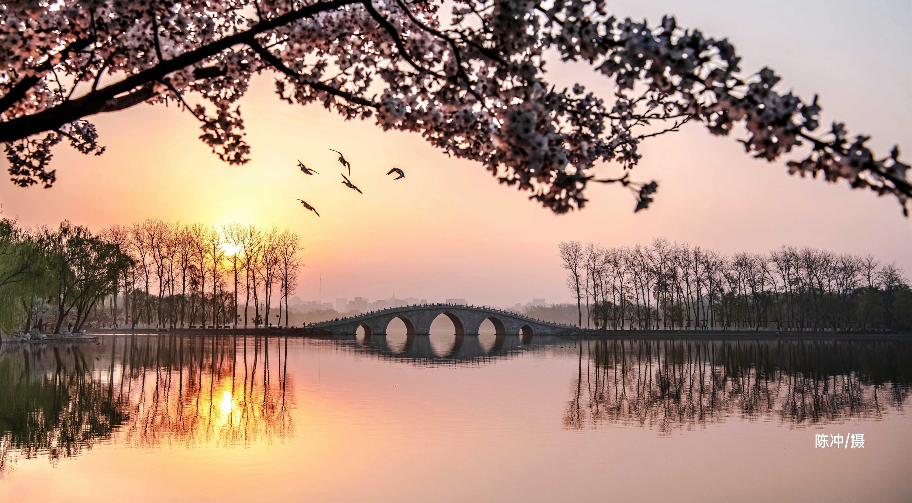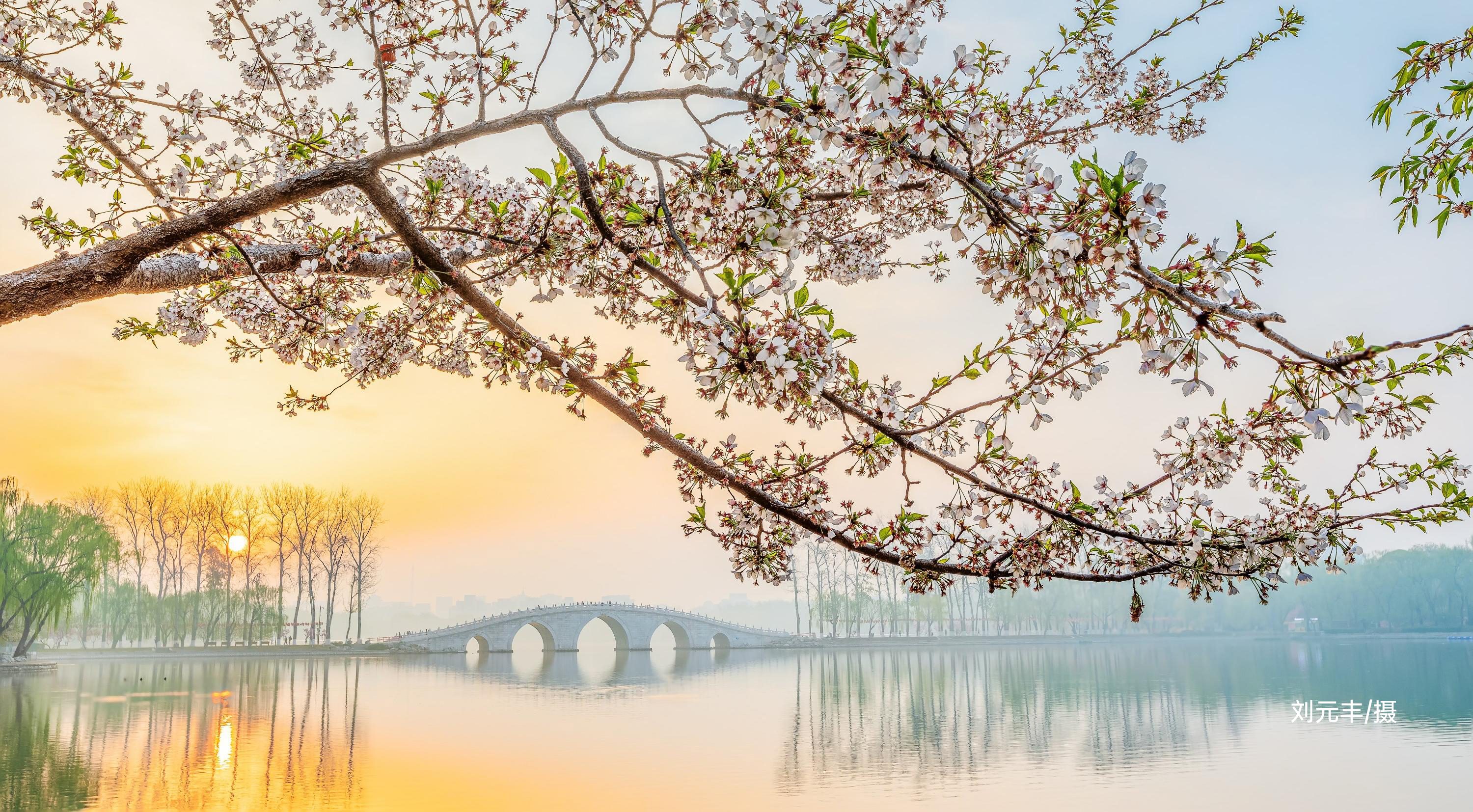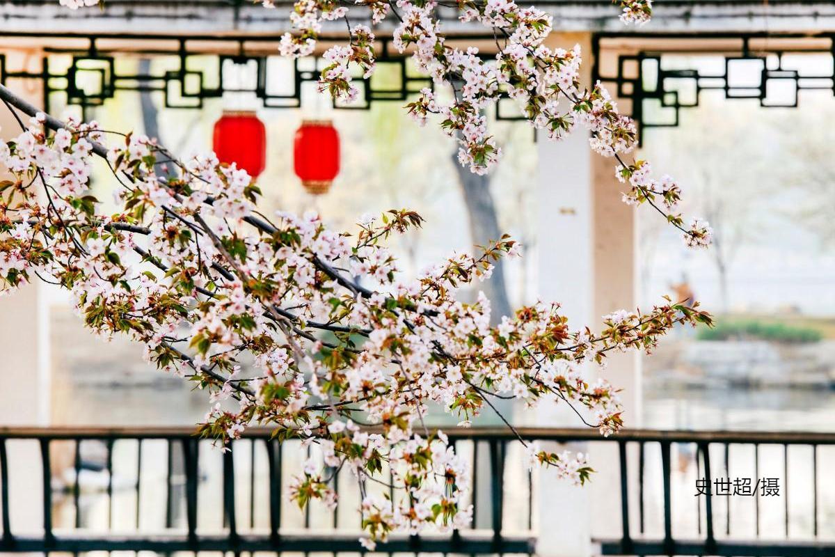 园内目前体量较大的一株吉野类樱花,独立湖畔丰姿绰约。她横生的花枝舒展秀丽,像热情开张的臂膀。她与春水相映而成的画面,已成为公园樱花的代表景致,也成为游人争相合影的佳处。
