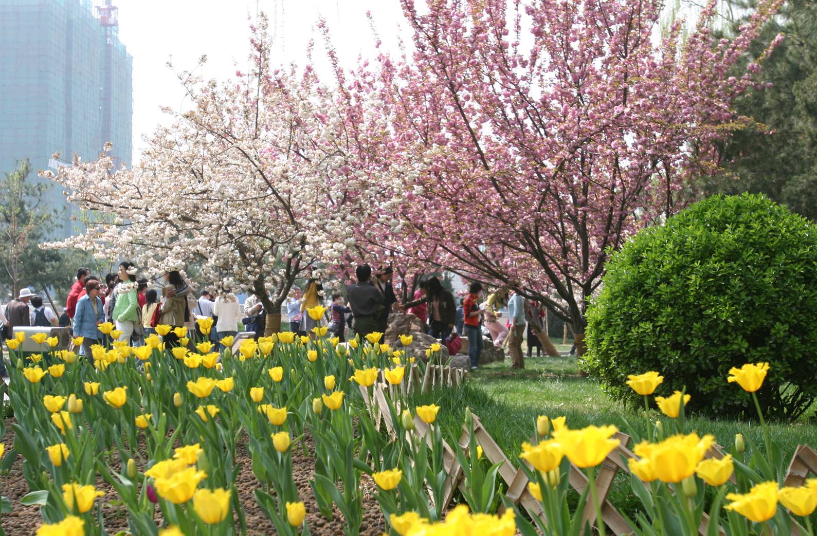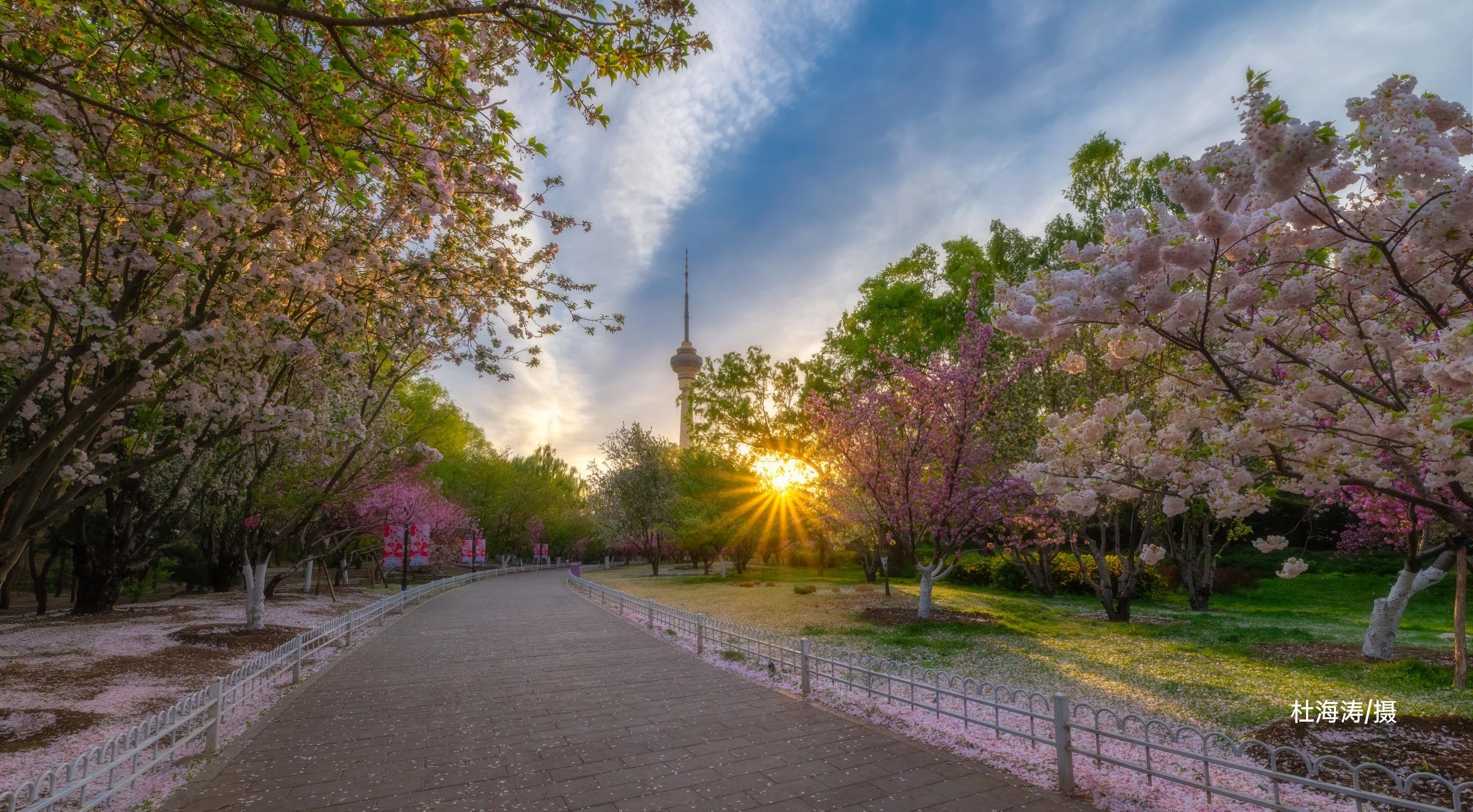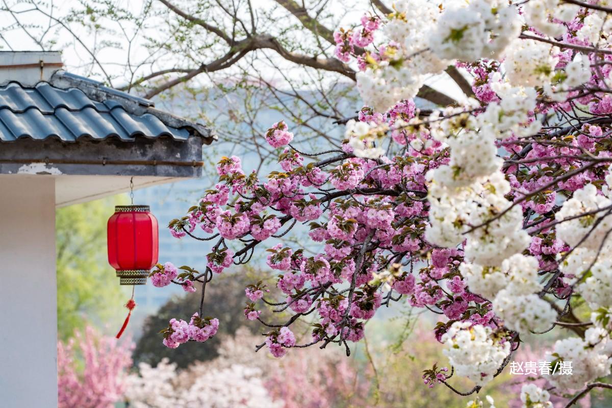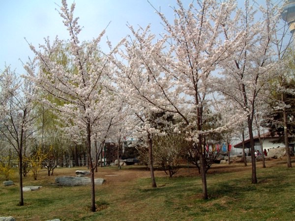 1994年从樱花园移栽的6株关山和普贤象,因该区域小环境优越,长势旺盛。阳春4月,她们在朝辉和夕阳里倚墙怒放,形成了公园东部灿烂一景。近年来这里又陆续补植了松月、染井吉野等品种,使得赏樱时间提前到了3月下旬。