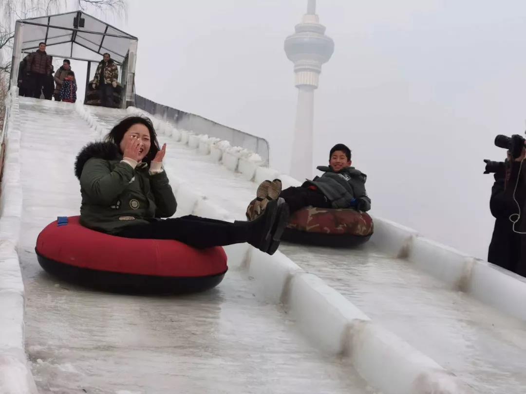 今年公园冰场汇集了双道冰滑梯、冰上自行车、单人冰车、双人冰车、冰上碰碰车、冰上龙舟及冰刀自由活动等七项冰上运动,为游客打造出宽阔舒适的冰上健身游乐环境。值得一提的是,场内一座由千余块冰砖铺垫,高6米、长70余米的双道冰滑梯吸引了许多游客前来“打卡”,大家乘坐冰滑梯飞驰而下,不仅能体验极速滑行的快感,还能将公园冬季美景尽收眼底。