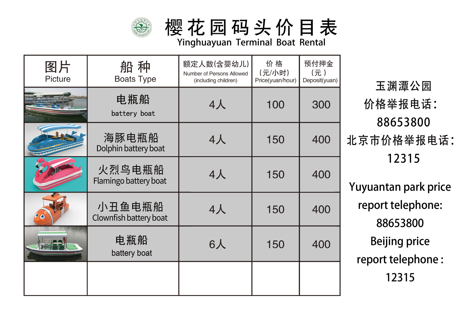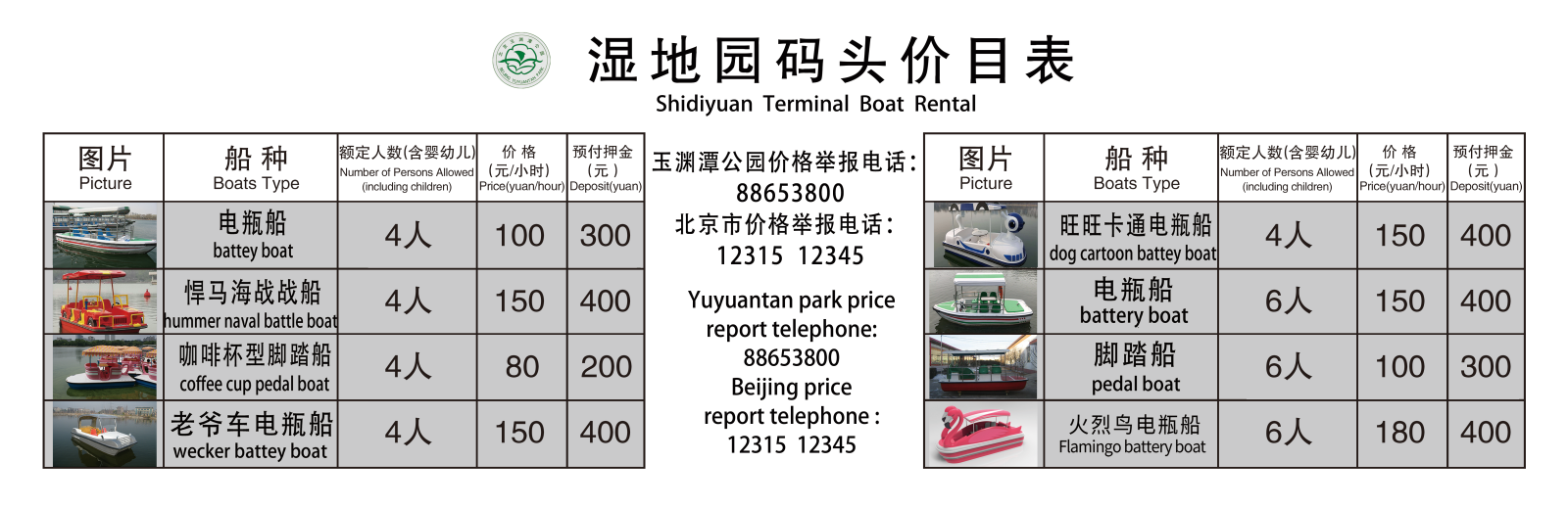 公园有四座码头,分别是位于西湖北侧的樱花园码头,西湖南侧的南山观樱码头,东湖北侧的湿地园码头和东湖南侧的远香园码头。四座码头拥有的船型有所不同,请游客仔细查阅相关信息。